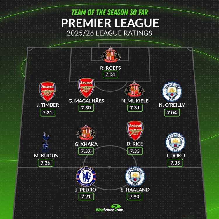中场:库杜斯(热刺)、扎卡(桑德兰)、赖斯(阿森纳)、多库(曼城)