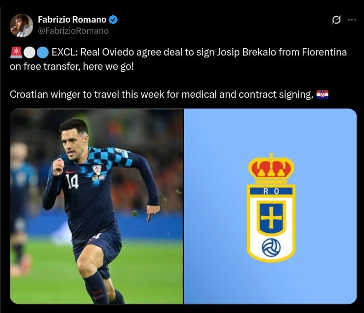 8月20日讯 据著名转会大家罗马诺报说念,皇家奥维耶多将签下克罗地亚球员布雷卡洛,Here we go!