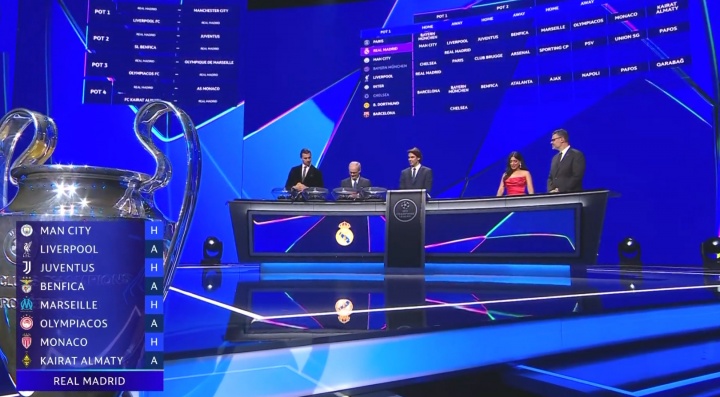皇马敌手:曼城(主)、利物浦(客)、尤文(主)、本菲卡(客)、马赛(主)、奥林匹亚科斯(客)、摩纳哥(主)、阿拉木图凯拉特(客)