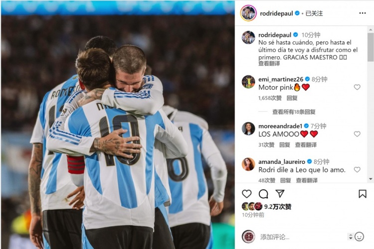 此役是梅西在国内临了一次为阿根廷队出战,德保罗社媒晒出拥抱梅西的像片,配文:“不知还有多久,但直到临了一天,我齐会像起首那样赞佩与你在沿路的时光。谢谢你,大众。”