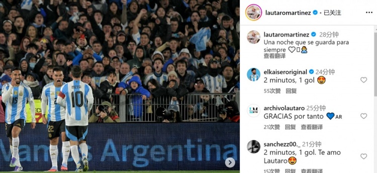 此役是梅西在国内为阿根廷出战的终末一场比赛,劳塔罗社媒晒出与梅西庆祝进球的合照,配文:“一个不灭难忘的夜晚。”