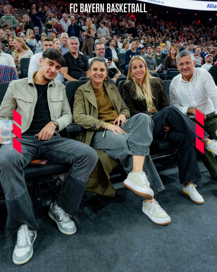 欧洲篮球联赛,拜仁主场97比88打败红星,拜仁俱乐部主席海纳、拜仁中场帕夫洛维奇、拜仁女足球员达姆贾诺维奇、格温现场不雅看比赛,为拜仁男篮壮胆。