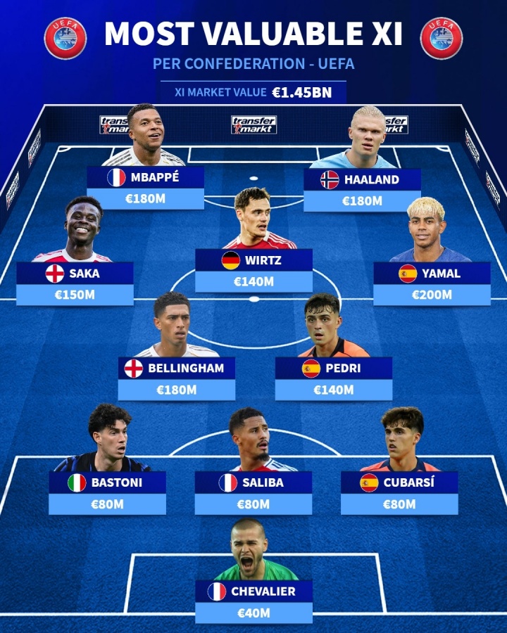 时尚:亚马尔(2亿欧)、姆巴佩(1.8亿欧)、哈兰德(1.8亿欧)、萨卡(1.5亿欧)