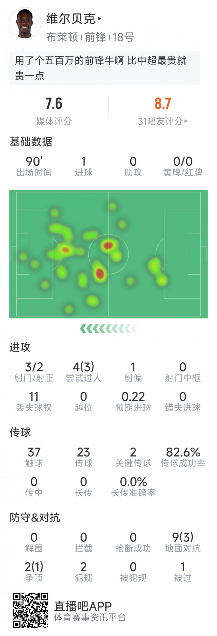 10月26日讯 在本轮英超,布莱顿2-4不敌曼联,以下为维尔贝克本场数据: