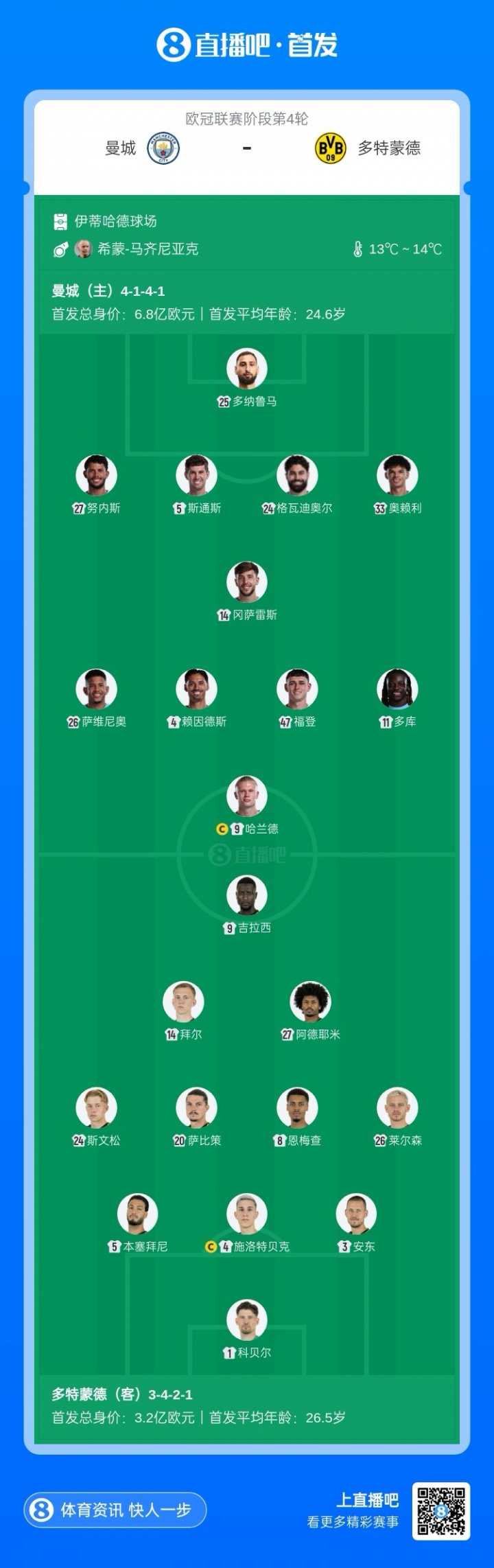 曼城首发:25-多纳鲁马、27-努内斯、5-斯通斯、24-格瓦迪奥尔、33-奥赖利、14-尼科-冈萨雷斯、4-赖因德斯、26-萨维尼奥、47-福登、11-多库、9-哈兰德
