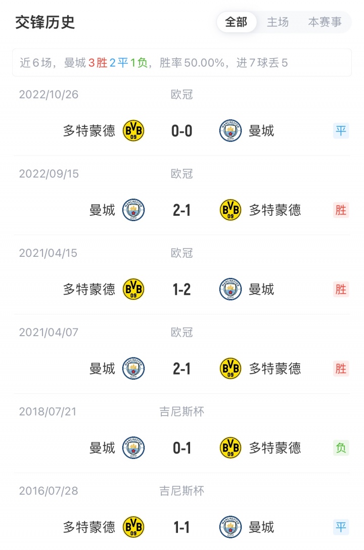 曼城欧冠2胜1平积7分,联赛6胜1平3负积19分位居英超第二,各项赛事两连胜;多特欧冠不异2胜1平积7分,联赛6胜2平1负积20分暂位德甲第三,各项赛事纠合4场不败。曼城对阵多特已纠合4场不败(3胜1平)。