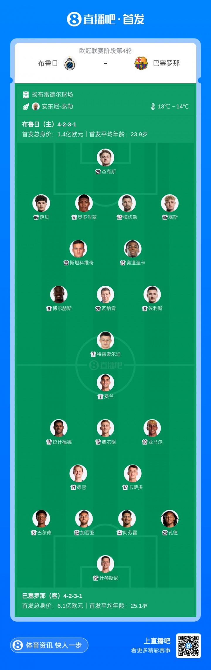 11月6日讯 北京技术11月6日4:00,欧冠第4轮,布鲁日vs巴萨。赛前两边公布了首发名单。【巴萨方面,延续了拉什福德-费兰-亚马尔三叉戟,中场位置卡萨多搭档德容构成后腰组合,此前伤愈的莱万、奥尔莫本场连接替补待命。】