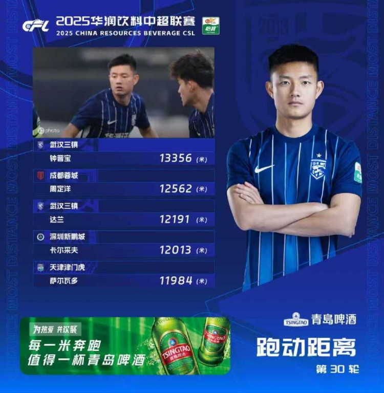 11月24日讯 中超第30轮跑动榜公布,其中武汉三镇两将入选,钟晋宝位列榜首,蓉城队长周定洋列次席。