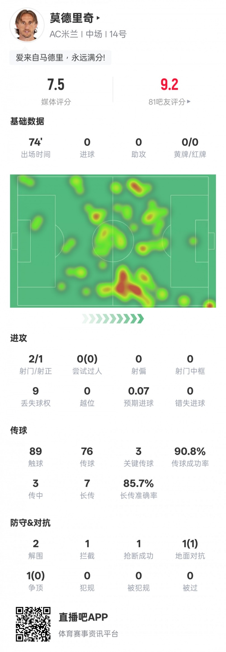 莫德里奇本场比赛数据如下: