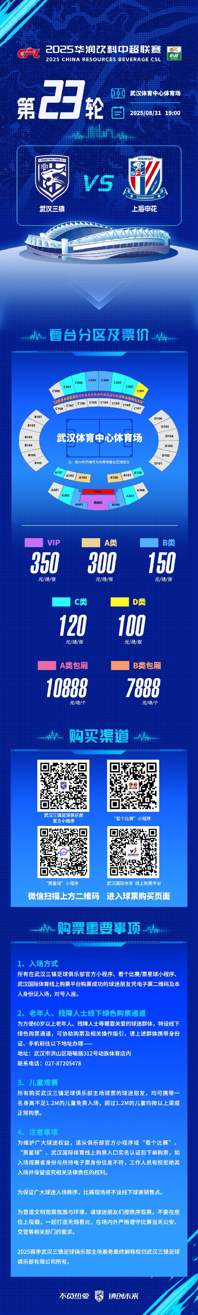 8月31日,2025华润饮料中超联赛第23轮,武汉三镇将回顾主场迎战上海申花。本场比赛球票现已开启发售,接待诸位球迷一又友进行购买,你们的每一声大叫与饱读舞,王人将成为三镇将士前进的力量,让你我络续并肩而战吧!