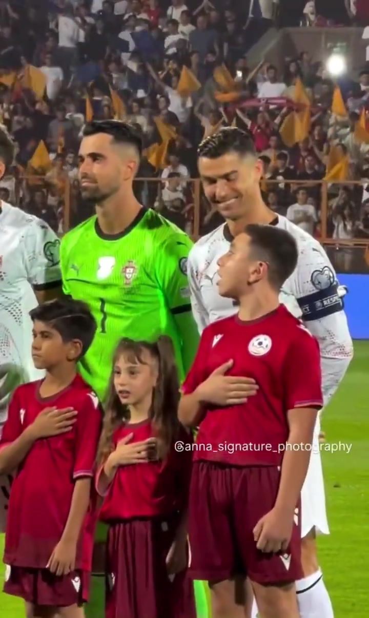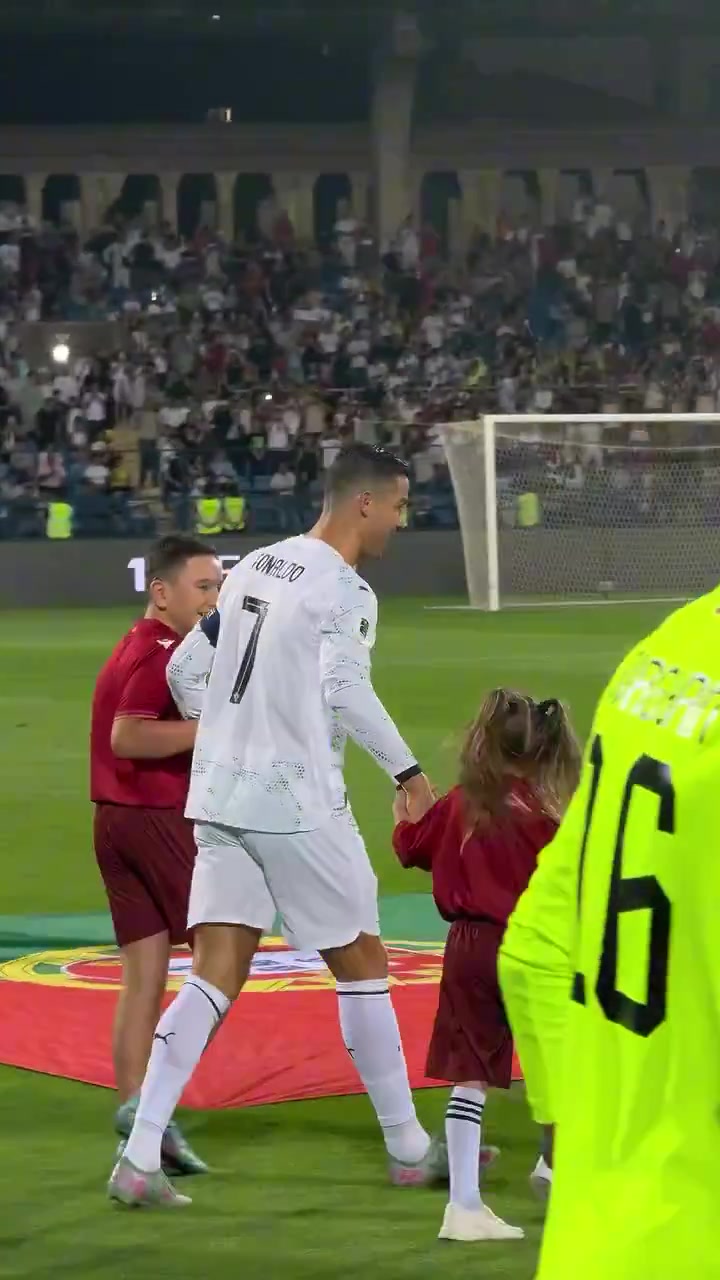 球员入场阶段还出现了有爱的一幕:C罗入场时提示着两位小球童,其中的小男孩泪流不啻,另一位小女孩则是在C罗瑰丽性的入场卓越后也学着作念起了C罗“SIUUU”的庆祝手脚。
