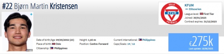 马丁-克里斯滕森,现年23岁,效劳于挪超KFUM,德回身价27.5万欧。他的母亲是菲律宾东谈主,2024年9月他肃肃归化菲律宾,代表菲律宾出场14次打进12球。