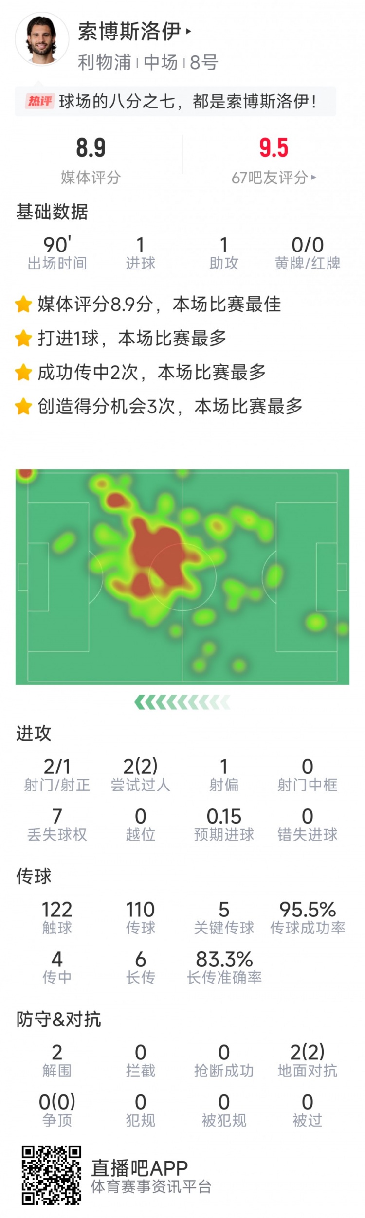 10月23日讯 在本轮欧冠,利物浦5-1大捷法兰克福。以下为索博斯洛伊本场数据: