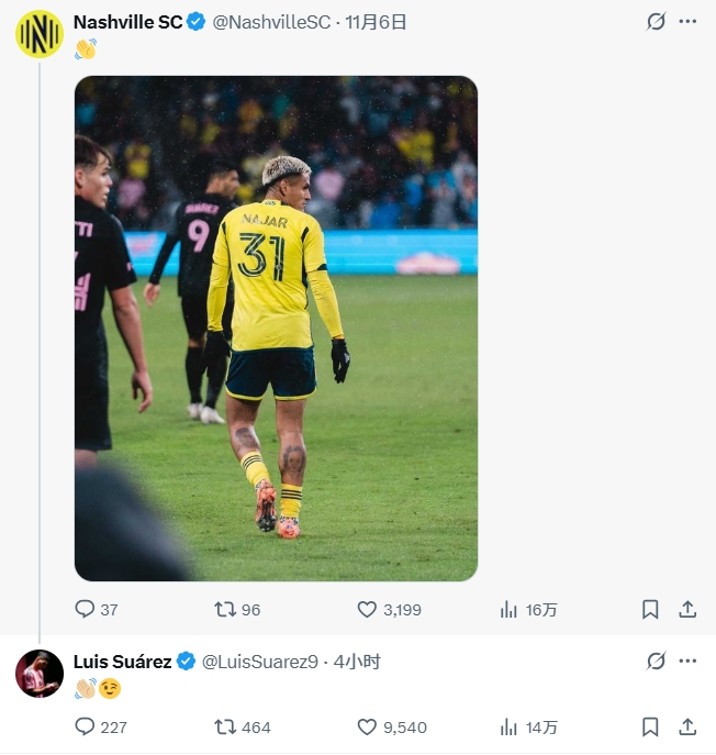 赛后苏亚雷斯褒贬了纳什维尔11月6日发的帖子。那时纳什维尔赢下比赛后,发了一个姿首👋🏼