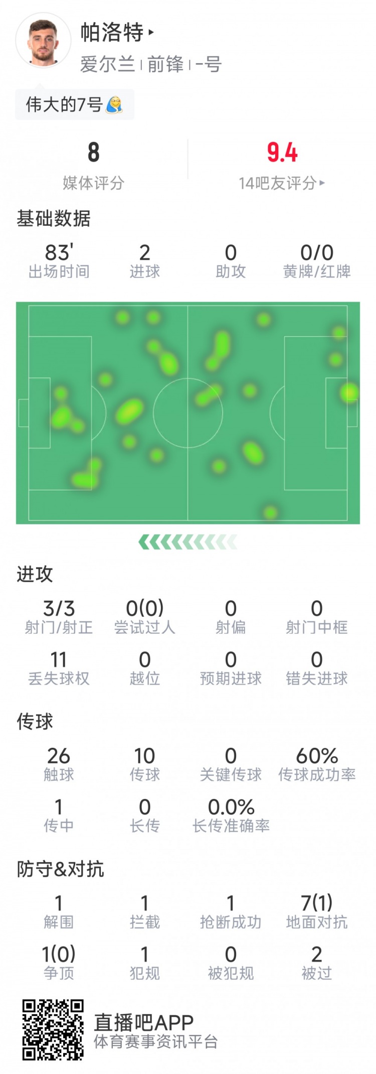 据统计,帕洛特纠合两场代表爱尔兰梅开二度,是球队历史第四位作念到这少许的球员,此前三位是邓恩(1936年)、基恩(2013年)、罗宾逊(2021年)。