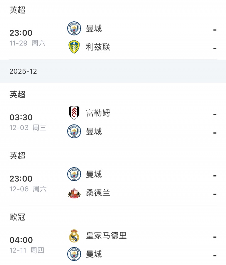 曼城之后3场比赛要在联赛先背靠近利兹联、富勒姆和桑德兰,然后鄙人一轮欧冠靠近皇马。