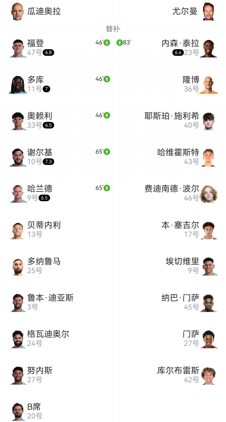 曼城虽在半场和第65分钟换上整个主力,其中包括哈兰德、福登、多库、谢尔基、奥赖利,瓜帅仍难支援输球结局。