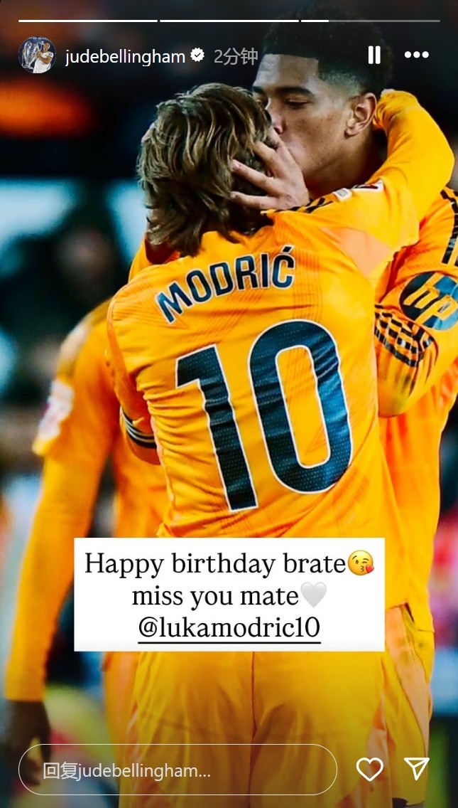 9月9日讯 今天莫德里奇迎来40岁诞辰,贝林厄姆在社媒晒照送祝愿。