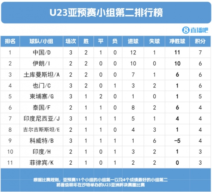 阐明规则,U23亚初赛11个小组的小组第一以及4个收货最佳的小组第二将晋级来岁在沙特举办的U23亚洲杯决赛圈比赛。