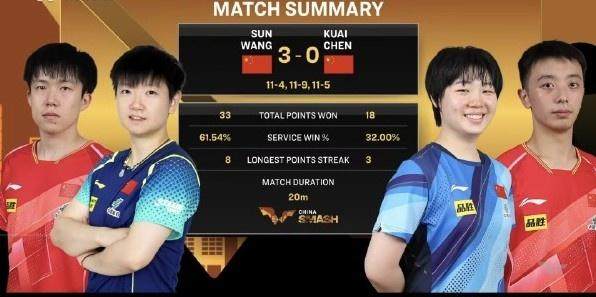 2025年WTT中国大满贯混双1/4决赛,王楚钦/孙颖莎以3比0(11比4、11比9、11比5)征服队友陈垣宇/蒯曼,晋级四强。王楚钦/孙颖莎半决赛的敌手是巴西组合雨果/高桥·布鲁娜。