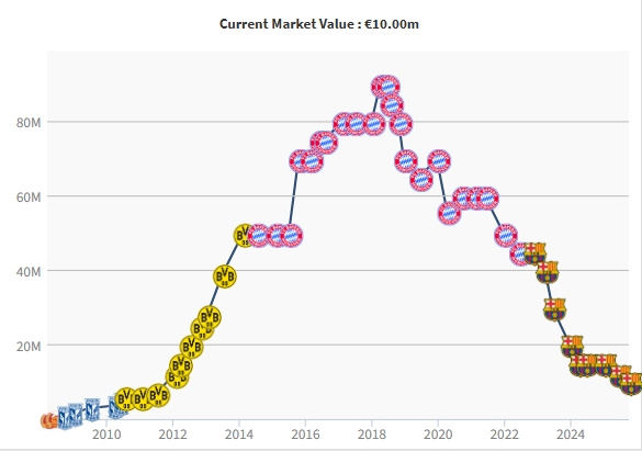 莱万的身价曾在2018年遵守拜仁时期达到巅峰的9000万欧。