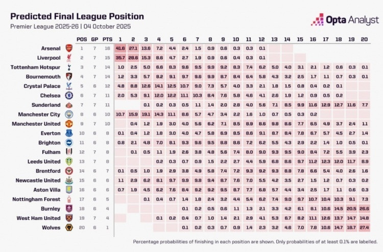 此役事后,数据机构 OPTA 超等操办机臆测本赛季英超冠军,阿森纳以 41.6% 的概率捧杯,利物浦的夺冠概率为 35.7%,曼城则为 10.7%,切尔西的冠军率仅为 2.0%。