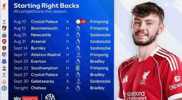 值得一提的是,据太空体育统计,本赛季利物浦莫得任何右后卫流通 4 场首发。比如对水晶宫、伯恩茅斯等多场比赛,首发右后卫不休变化,此役则是布拉德利担任利物浦首发右后卫。