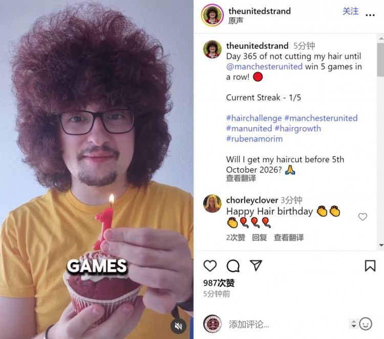 蓄发哥社媒晒出总结蓄发一周年视频,配文:“不剪头发直到曼联5连胜,已往日365天,刻下连胜景色——1/5。”