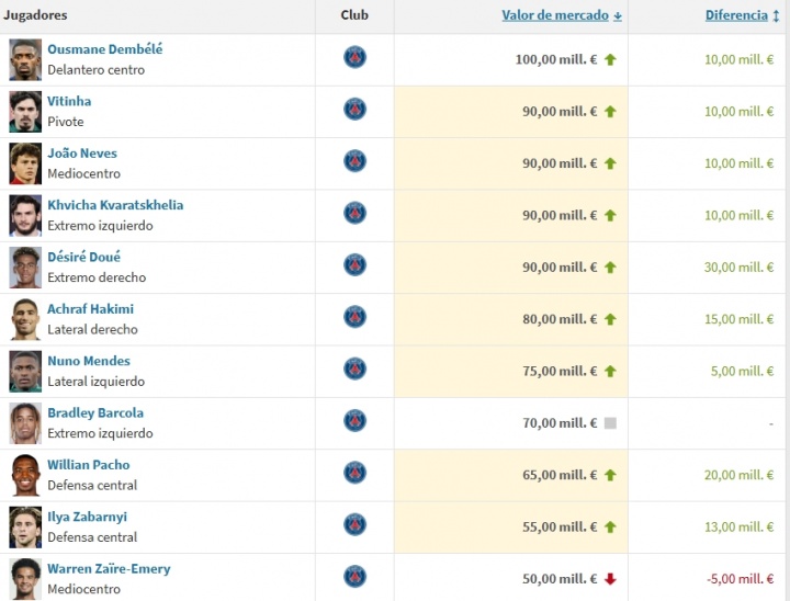 10月10日讯 当天德转更新法甲球员身价,登贝莱身价高潮至1亿欧名次法甲第1,维蒂尼亚、内维斯、克瓦拉茨赫利亚、杜埃四东谈主身价高达9000万欧,法甲身价前10位齐为巴黎球员。