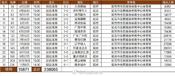 2025中甲联赛延边龙鼎队现场不雅世东说念主数统计:悉数238065东说念主次,场均15871东说念主。