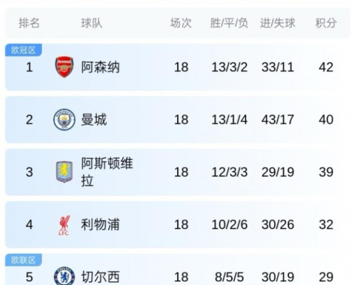 英超第18轮,阿斯顿维拉客场2-1逆转切尔西,阿森纳2-1布莱顿,曼城客场2-1征服诺丁汉丛林。就此,阿森纳也曾领跑者比曼城高的,不外分差确实是太低了。阿斯顿维拉链接紧追他们,利物浦回顾到第四,蓝军在第五。