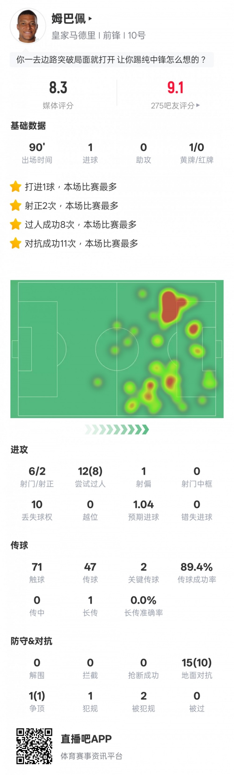 8月20日讯 2025-26赛季西甲首轮,皇马1-0投降奥萨苏纳,姆巴佩首发出战,造点+点射,另外还有8次过东谈主收效,评分8.3。