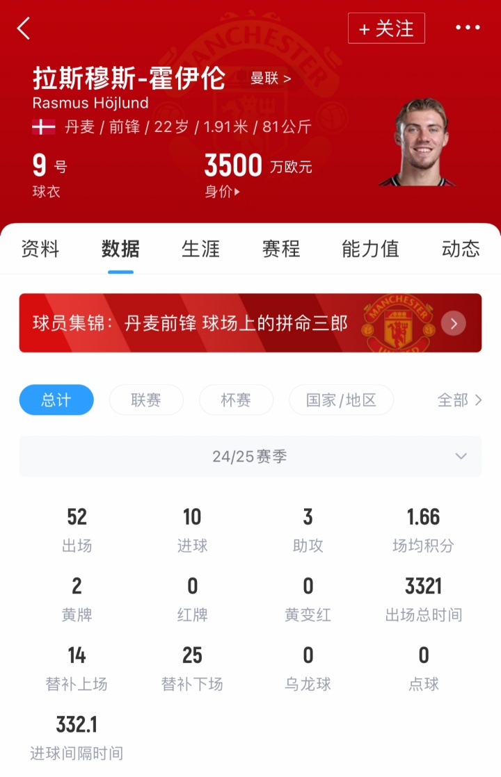 霍伊伦时年22岁,上赛季为曼联出场52场,获得10粒进球和3次助攻,现在其德回身价为3500万欧。
