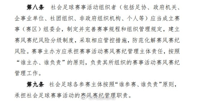 固然了,凡是对中国足协责任有点了解,懂点新体育法的,简略看过这个文献的,王人不至于念念出个这样搞笑的有关。因为这个文献出台布景是苏超出身之前的事情,内部甚而阐述真正规章了分好了中国足协和场地足协、社会办赛方的职权义务,甚而规章场地赛当事人持者才是赛风赛纪第一背负东谈主,弘大球迷忍无可忍的赛风赛纪问题目下捋顺了明确的责任单干,反而对苏超这类社会赛事来说是个大大的功德。