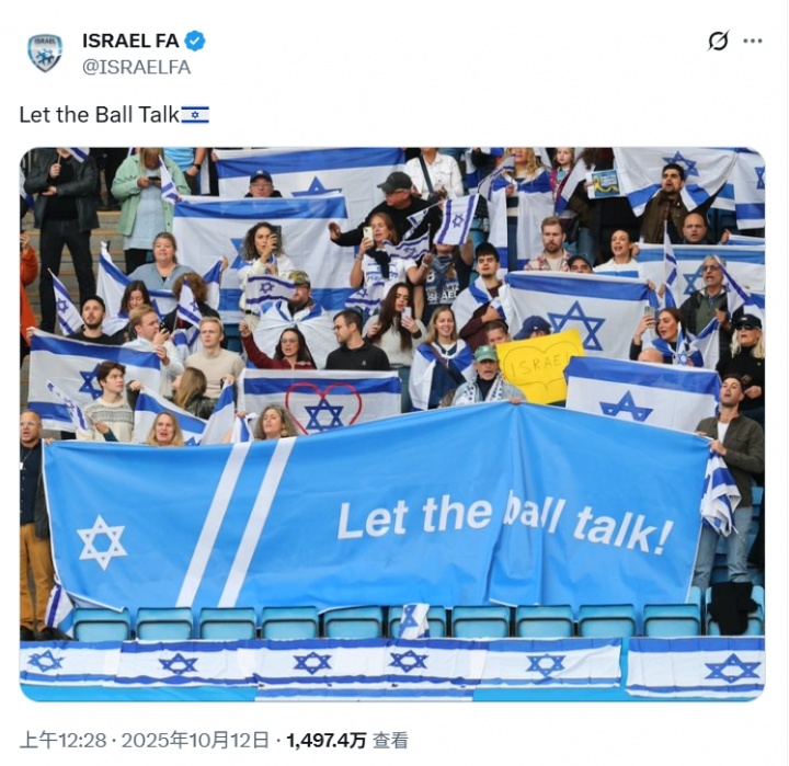 以色列足协援用横幅中的笔墨写说念:“让足球言语”,意在敕令外界柔软比赛而非政事抗议,但以色列最终大比分溃败,这则帖文赛后也引来了上千条的回复。