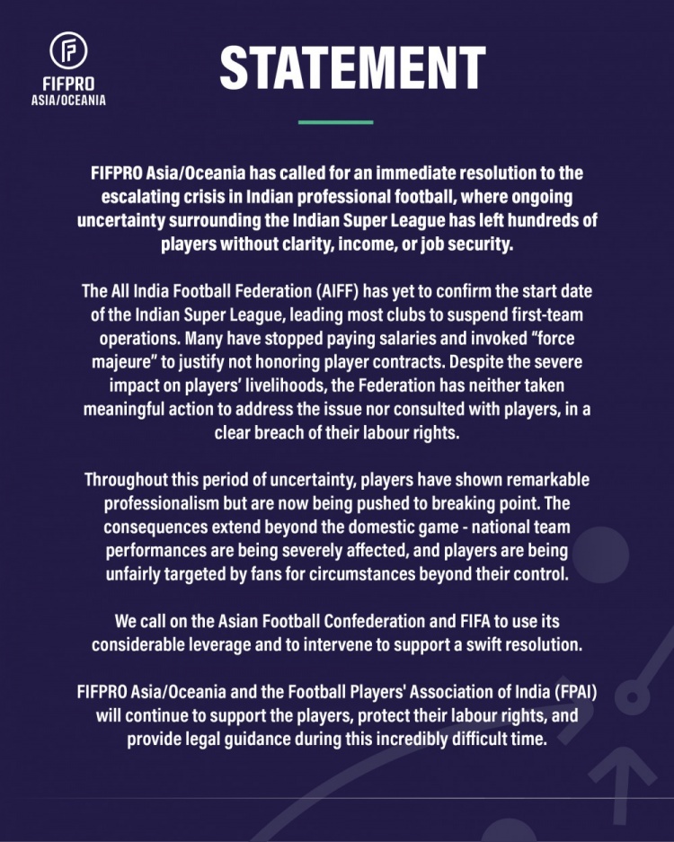 海外做事足球清爽员协会亚洲/大洋洲分会号召立即搞定印度做事足球日益加重的危急,印度超等联赛执续的不笃定性已导致数百名球员堕入出息不解、收入中断、责任保险缺失的窘境。
