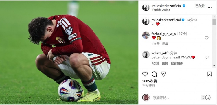 凯尔凯兹此役为匈牙利踢满全场,但未能匡助球队赢得附加赛经历,赛后他在应付媒体上晒出我方蹲在球场内失意的相片。