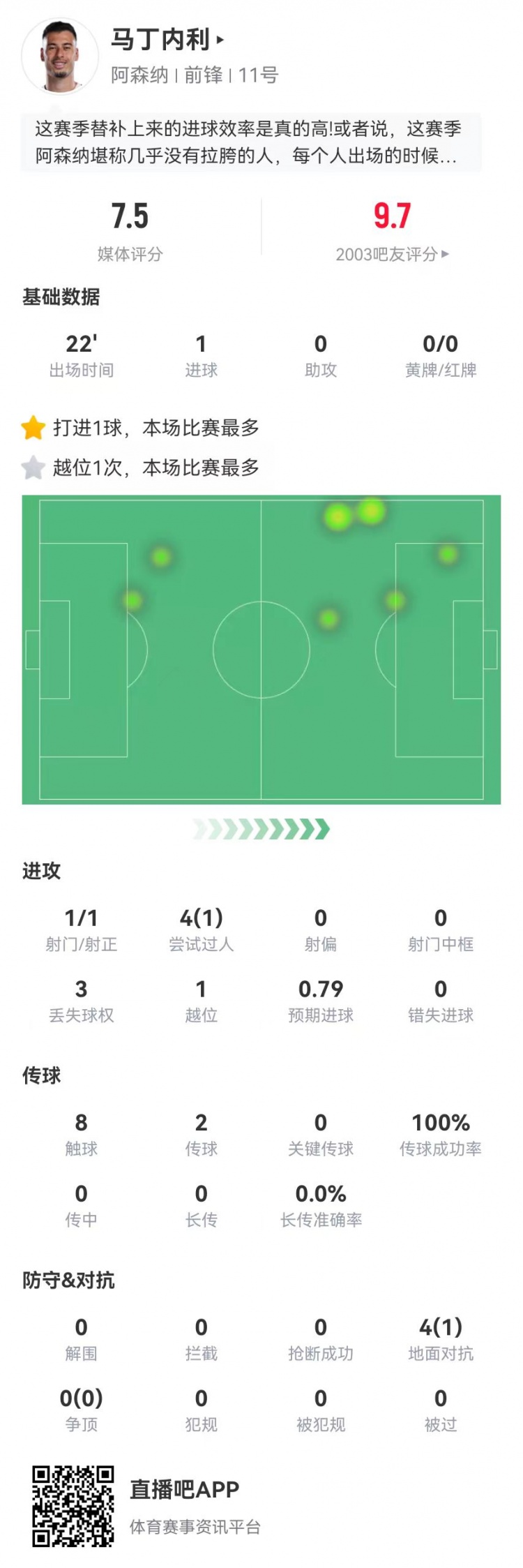 11月27日讯 阿森纳在本轮欧冠主场3-1力克拜仁,马丁内利本场数据如下: