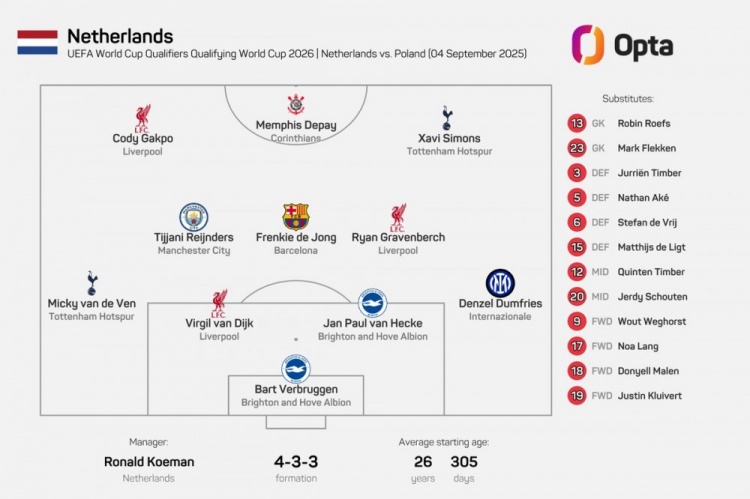 9月5日讯 荷兰在本轮世初赛主场1-1战平波兰,荷兰队本场比赛首发有8东谈主齐来自英超。